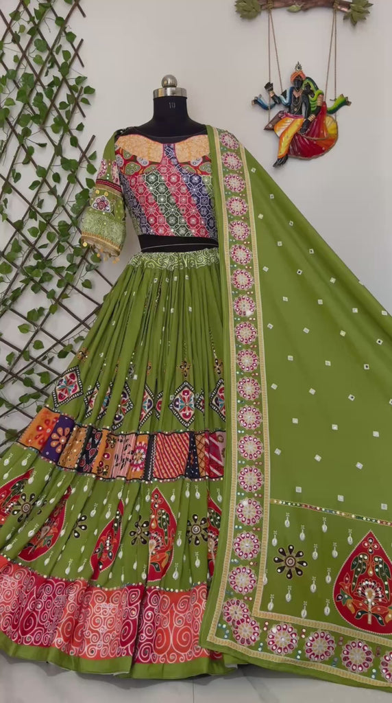 Green Color Digital Printed Mirror Work Navratri Chaniya Choli